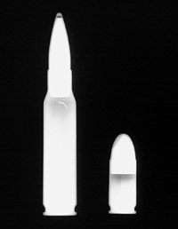The radiographic appearance of a .308 rifle cartridge and a 9 mm Luger handgun round are shown below to demonstrate the seating of the bullet in the casing.